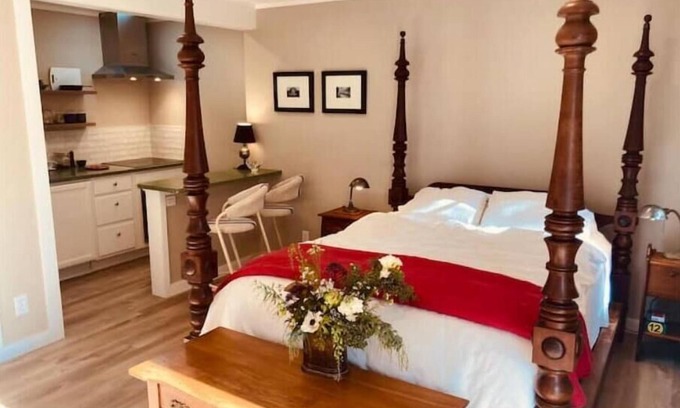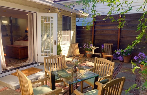 The Garden Room is a licensed, centrally-located, and peaceful studio. Full of hand-crafted, vintage, and one-of a kind decoration and details, this space was designed with love by all members of our family. We look forward to hosting you in our beloved home town. The Garden Room sits in the ideal location to enjoy all that Healdsburg has to offer. Just a block from the central plaza, fine-dining, wine tasting rooms and so much more.