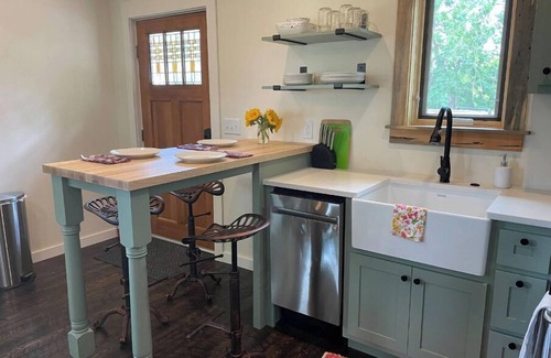Our guest house is finished with modern farmhouse charm and nice details. White quartz counters, custom cabinets, locally milled rough sawn floors. It also has air conditioning and on demand hot water.