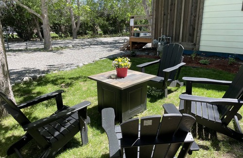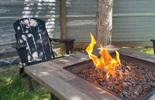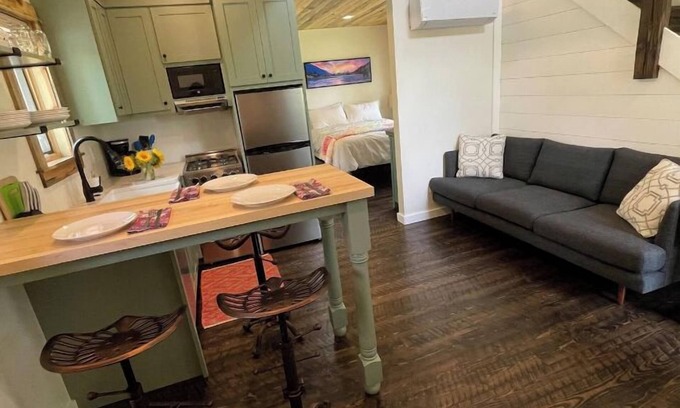 Cheery with abundant natural light, The Roost is a 500 sq. ft. two story "not so tiny, tiny home" set among old growth cottonwood trees in a relaxed older neighborhood. Downstairs is a queen bedroom with en-suite bath, trundle in loft and air-conditioning. Numerous easy-open windows connect guests to the outdoors while the living/dining area offers R&R for family and friends with a full-sized sofa and fully equipped kitchen. Outside enjoy barbecuing and dining at the patio table.. The small front yard with privacy fence has 4 Adirondack chairs and a fire table to enjoy a quiet evening. Listen for the hoot of owls that live here and take in the stars that shine brightly without competition from other lights.