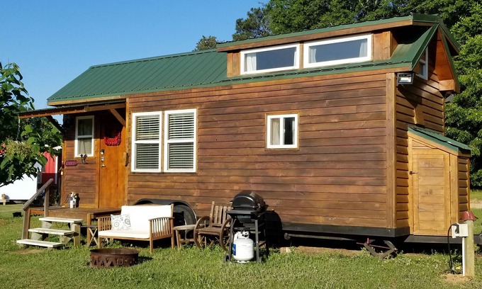 The Rosebud Tiny Home is a stylish rustic home 336 sq ft with a queen size bed in the loft. Wake up to a view of our horse pasture and amazing sunrises. Full kitchen and bathroom. Located on 10.5 acers with horse, Hollywood donkeys (featured on our episode of House Hunters on HGTV), a pet pig and 2 VERY friendly yard cats. At night sit around the out door sitting area enjoy the fire pit and view of the stars in the night sky