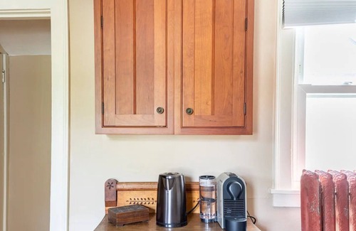 In this upstairs suite, you will find a cozy love seat, games, coffee and tea bar, and a flatscreen tv to unwind. The stylish bathroom sports a rain head shower and a heated floor furnished with plush towels and robes. The bedroom has a delicious Queen bed with black-out blinds to ensure your restful sleep. The suite is equipped with Wi-Fi and bedside plugs for all your devices.