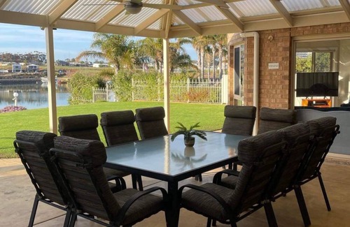 The downstairs living area consists of an open plan family room with smart TV and DVD player, kitchen and a 14 seater meals area all looking onto the marina.There is a separate lounge with TV and DVD player and a dining room with a 6 seater table and a third toilet next to the laundry. Upstairs has a rumpus room with a pool table, a bathroom and a balcony with table and seating overlooking North beach. In the garage there is a table tennis table, dartboard, quoits set and a fridge with filtered water and ice on tap. Outside there is an undercover entertaining area hosting a 10 seater table setting with 4 extra chairs nearby with a 4 burner Footymaster B.B.Q and large gas Weber Q.There is also a large grassed area and plenty of seating on the marina.