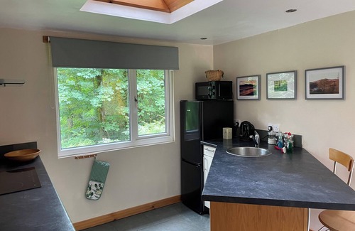 The property was formerly a Forestry Commission Office and has been tastefully converted to a very attractive, cosy two double bed-roomed holiday home. This high standard innovative convertion was completed in August 2008. The main bedroom has en-suite bathroom with king size bed and the efficient underfloor heating throughout the property provides all year round comfort. The property is extremely light and airy as it benifits from south and west facing patio doors, with feature light shafts in the kitchen and living room. There is a modern well fitted kitchen with slate floor, where you can sit at the breakfast bar enjoying a wonderful view through the trees to the Galloway Hills or maybe spot a red squirrel leaping from tree to tree. As well as Red Squirrels there is Roe Deer and an abundance of bird life surrounding The Shack. During your stay we will provide a bag of feed for children (or adults) to feed the birds and squirrels.