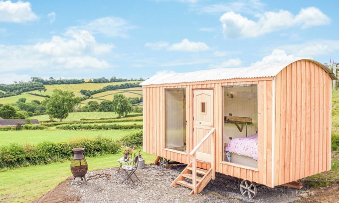 Shower Room: Cubicle Shower, Heated Towel Rail, Toilet. Electric heating, electricity, bed linen and towels provided. Welcome pack. . Front garden area with sitting-out area, garden furniture and BBQ. Bike store.1 small dog welcome. Private parking for 3 cars (slightly away from the property). No smoking. Please note: There are 3 steps in the garden. There is no Wi-Fi or TV.. A delightful group of three shepherds huts offering guests a stunning, rural location with fantastic views over the surrounding countryside. These detached huts offer guests comfortable accommodation with spectacular views to the front. Set on a working farm, they are near to many areas of interest, such as The Elan Valley Dams at nearby Rhayader. They are within easy reach of Clywedog Reservoir and Powys Castle. It is an ideal spot for birdwatching, cycling and walking, and the west coastline is only an hour’s drive away. Other attractions include Lake Vyrnwy, source of the Severn, Hafren Forest, Plymlimon Hills and Devils Bridge. This is also a great base for the Royal Welsh Show in Llanelwedd. Close by are towns such as Newtown and Llandiloes which both host an array of bars, shops, and restaurants, and also a good range of takeaways which guests can use and enjoy at the property. The Shearers Hut can be booked together with The Cider Pressers Hut (UK39773) and The Sawyers Hut (UK39775) to accommodate up to 6 guests.