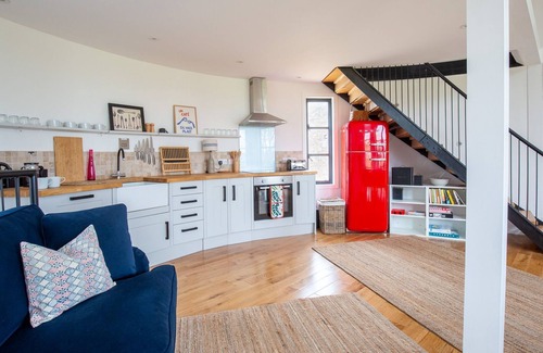 The hub of the Silo, the open plan area encompasses the first floor with high windows bringing the outdoors in. French doors open to a Juliet balcony beside the dining area which seats six on comfortable chairs. At the centre of the room is the sofa which can be converted into a double bed. Curl up here and watch a film on the Smart TV as you relax at the end of a busy day. The kitchen has been fitted along the curve of the wall with an oven and hob, dishwasher and statement red fridge/freezer tucked under the stairs.