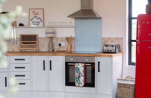 As you race in to find your way around, you will find the master bedroom on the ground floor with French doors looking out across the garden. Embracing the shape of the silo, this super king-size bedroom has wooden beams above mimicking sun rays and in the en-suite the circular shower is a wonderful addition. The open plan living area has a dining table in front of the stunning views with kitchen units shaped along the curved wall. Spend time here over evening meals and board games with the Juliet balcony doors open to really appreciate this area. The sofa here can be converted to a bed while the second bedroom is on a mezzanine second floor.