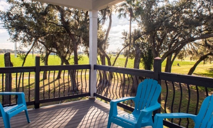 The Strawberry Field Stilt House is a 1 bedroom/1 full bath home located on five acres in Plant City. The home is 555 square feet with a king size bed in the bedroom and a queen pull out sofa bed in the living room. There is a 150 square foot elevated front porch that is easily accessible from the living room. The home has a full size stackable washer and dryer. Laundry detergent and dryer sheets are provided. The bathroom has a walk in shower enclosure and 1 sink. A fresh bar of soap is provided for each new guest along with shampoo and conditioner. There is a blue ray DVD player in the living room.