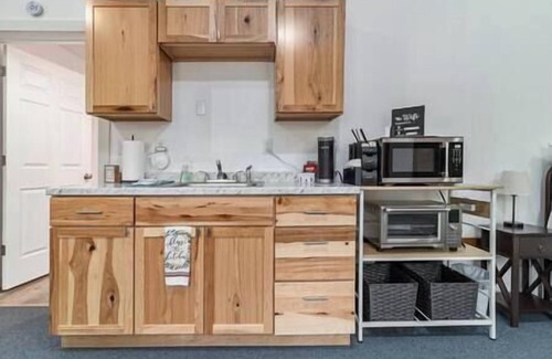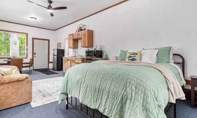 Welcome to The Studio, where you can enjoy the Pere Marquette River. The Studio has a queen bed and a queen pull out couch bed. We offer a Keurig coffee maker, toaster oven, microwave and refrigerator. The bathroom has a shower only. There is a private fire pit with chairs. The view of the river is limited depending on the season. You will take ten designated steps, where you can easily access the river by crossing Washington Rd and entering on the North side of the bridge (please make sure you enter from the North side of the bridge & respect any no trespassing signs) where you can enjoy kayaking and fishing. This is a shared property with The Little Red School House so if you have a larger group, you can rent both.