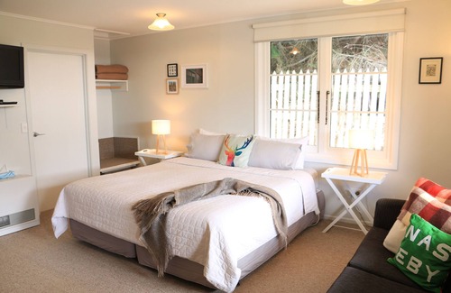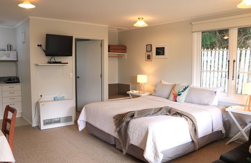 Studio unit sleeps 2 people. Configuration is 1 x king bed, or 2 x single beds on request at time of booking. Beds have electric blankets. Ensuite bathroom. Kitchenette with hot plate, microwave and fridge. Heating is via heat pump. Outdoor deck with BBQ.