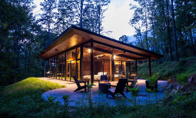 The Study…minimalist, modern design. Created with floor to ceiling glass, offering a 360 degree view of nature. Gaze outward, while feeling perfectly cozy within. Inside harmoniously flows out onto the patios, complete with 6 person hot tub, Malm fireplace, gas grill and dining space. Located on our 24 acre forested property, enjoy your holiday in peace while easily accessing the famed Hocking Hills hikes just 5 miles away.