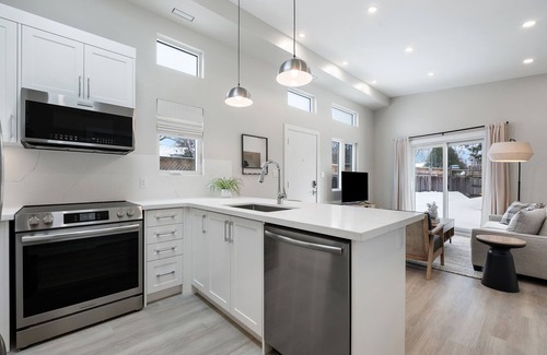 ✓ Kitchen – A fully equipped kitchen with plenty of space to prepare meals and cook up a storm during your stay. Features all stainless steel appliances: counter depth refrigerator, front control electric range with total convection system, top control dishwasher, and over-the-range microwave. Includes Keurig coffee maker, toaster, electric kettle as well as kitchen essentials (cutting boards, mixing bowl sets, etc), tableware and utensils. Features skylight to bring in lots of natural light as well as undermount cabinet lighting that provide enhanced visibility for tasks like cooking and food prep.