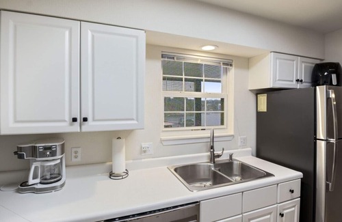The kitchen features stainless steel appliances, a dining room table that seats four, and all the essentials you need to prepare meals!