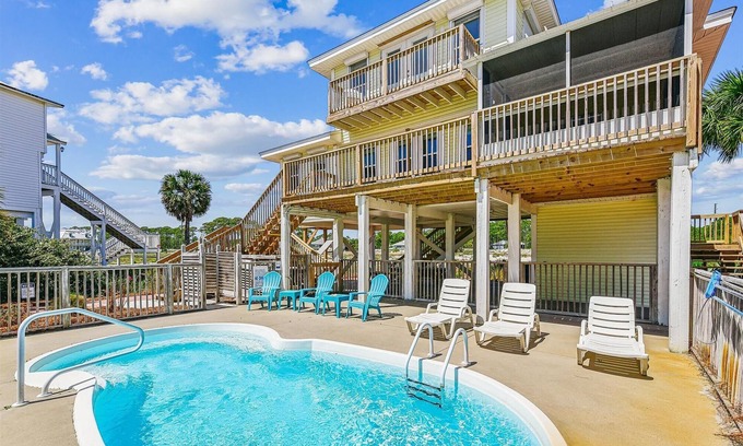 AMENITIES:Smart TV, Blu Ray DVD player, master bedroom with private deck, outdoor shower, ping-pong table, screened porch, sun deck. Private pool (heated for a fee) with large pool deck, under house living space, washer and dryer on ground level, and brick paved driveway. Ask about 5% Off Repeat Renter Discount.