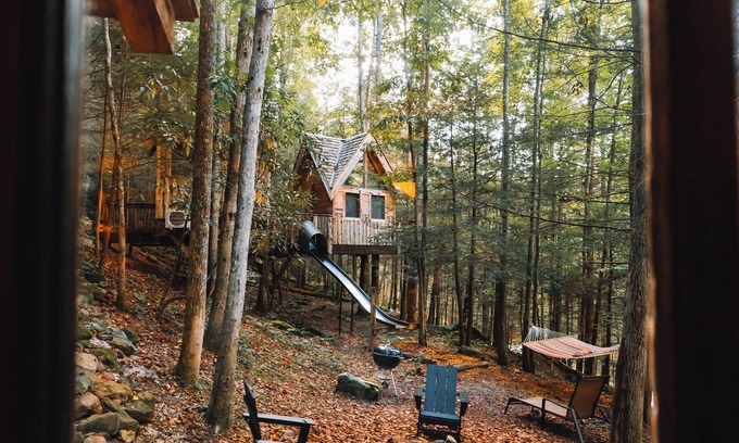 The treehouse has a serene view of Peregrine Rock and has ample parking. Other special features include cathedral ceilings, recycled building materials, a large wrap-around deck, air conditioning, a fire pit, and a ten minute nature walk to the Martins Fork trail head. This treehouse is great for adults, couples, families and kids of all ages!