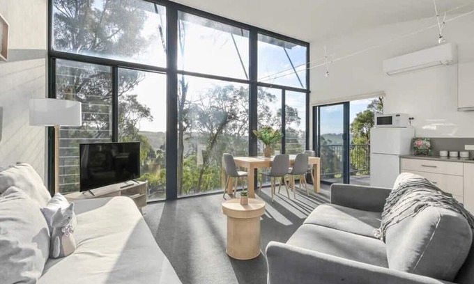 Nestled in the native bushland of the Tamar Valley, discover this serene 1-bedroom retreat. Enjoy tranquillity among the treetops with sweeping views of vineyards and the Tamar River. The retreat features a sun-drenched deck and bright, open living spaces.