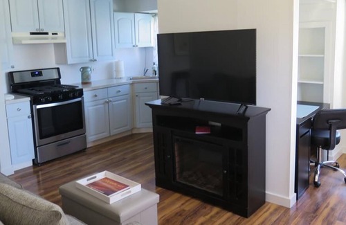 Lovely renovated apartment located just one block to the beach. This second floor one bedroom apartment is located in the cottage next to the main house. This modern unit provides a full kitchen, office area, dining area for four, washer and dryer. The bedroom offers a king bed and full bath the additional sleeping area is a queen pull out sofa in the living room. The apartment is also supplied with linens, eco-friendly bath products, beach, chairs, towels, umbrellas, bikes, and bike lock up area. Guests will also have access to a shared courtyard with fire pit, grill, outdoor shower and parking for two cars. Parking is located down the driveway to the left side of the Mission Inn. You will pass through the shared courtyard to enter this unit. Entrance is on the second floor the cottage building. Bicycles and beach equipment are located in the first floor of the cottage through the entrance on the front of the cottage. This property is no smoking anywhere on premise.