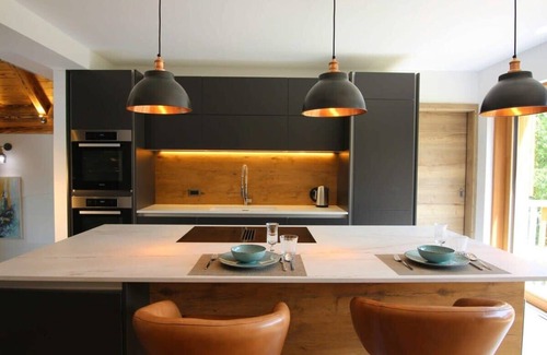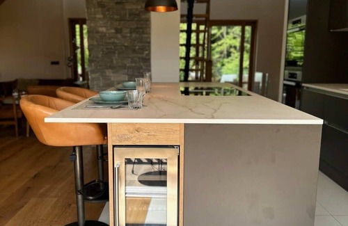 The Vila Bled boasts tree double bedrooms, each with its own Ensuite bathroom, offering privacy and convenience to all guests. Thoughtfully designed, the bedrooms feature bespoke handmade wooden furniture made from reclaimed timbers, ample storage space, and luxurious mattresses and covers ensuring a restful night's sleep. The unique "upside-down" design places the bedrooms on the ground floor, while the main living spaces occupy the first and second floors, maximizing the stunning mountain vistas.