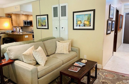 Update: Fall of 2022 we installed a Grohe hand-held shower head so that parents could more easily wash their children. In the summer of 2021 we added new artwork. In 2019 we installed a new 55” Samsung LED LCD Smart TV! It’s beautiful and has “Dynamic Crystal color”! We also installed a new modern Rohl kitchen faucet, a Rohl bathroom faucet, added new shower hooks, and bought new pans. In 2015 we did some remodeling and have made many changes to our condo including: all walls painted, four new louvered doors, new wood flooring, new chair rail, new sleeper couch with an extra large mattress, and two new bar stools. The furniture has been rearranged so the bed and couch both look directly at the TV. This provides better function and a more open feeling.