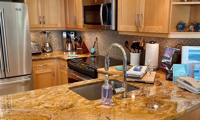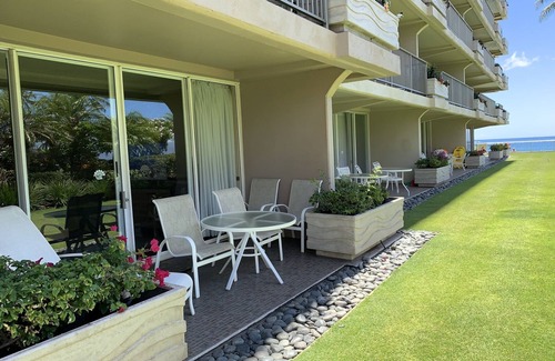 The ground floor location of this studio allows for convenient walk-in/walk-out access without the need to wait for an elevator. Just open the lanai sliding doors and you are steps away from the beach, the pool, and the Ka’anapali walkway. The courtyard offers a tranquil setting with tropical plants, a Koi pond with a waterfall, and the swimming pool. In the evening, the Koi pond is lit by romantic torches and lights. From the condo’s lanai, there are magnificent ocean views and the grassy area by the lanai gives the feeling of a private garden. It’s a delightful place to have a morning coffee or evening drink. The condo has been remodeled entirely and professionally decorated. It has a 55'' flat- screen smart TV, DVR for recording programs, free secure 5g Wifi, a fully equipped remodeled kitchen, a large king bed, a queen sleeper couch, a bathroom with a walk-in shower, and a free washer and dryer just outside the door.