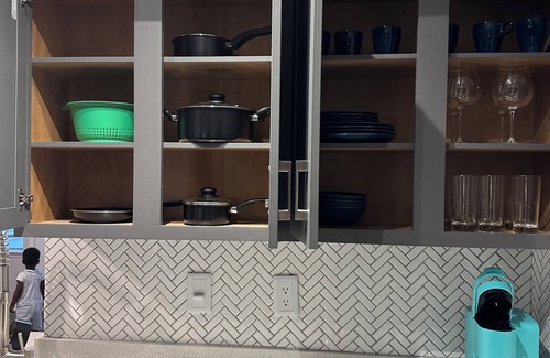 -Full kitchen set with cooking, eating and drinking utensils, Keurig coffee maker, , toaster, etc.