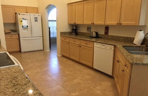 The modern kitchen is fully equipped with all the amenities of home. There are granite countertops and a breakfast bar for casual dining. Share meals with family and friends in the dining area that has a view to the lanai and pool.