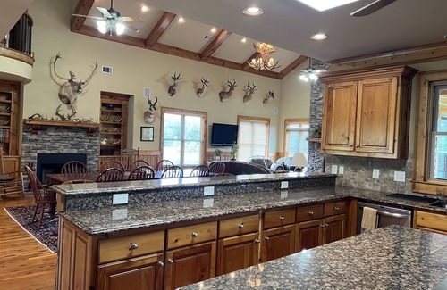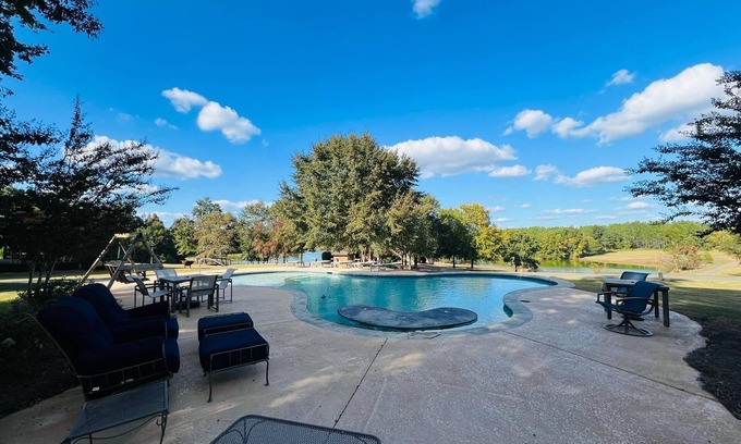 Situated on a picturesque lake in Fort Valley, GA, the lodge is an ideal setting for corporate retreats or family reunions. Guests can enjoy fishing in the lake, with a catch-and-release policy in place. The lodge features three floors, five bedrooms , eight beds, and five and a half bathrooms. It includes a fully equipped kitchen, two fireplaces, and a screened-in porch.