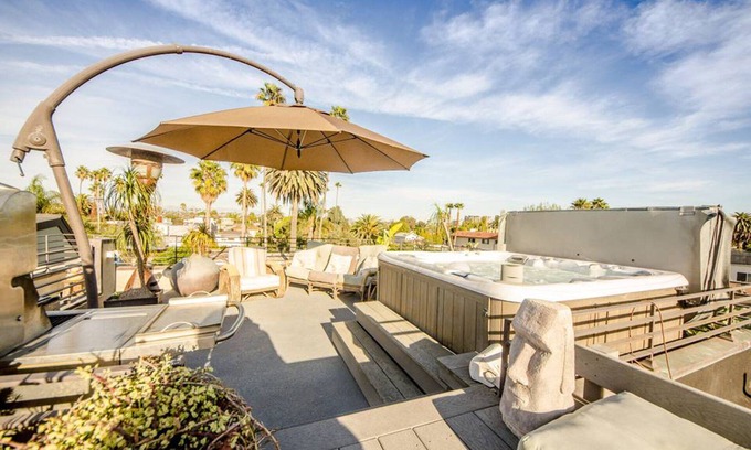 This custom-built, modern architectural mansion is the perfect home away for those who appreciate great architecture, romance, art, and history. Located near the historic Venice Canals, steps from the beach and Abbott Kinney, this unique and convenient property offers stunning 360-degree views and a rooftop hot tub overlooking the canals.