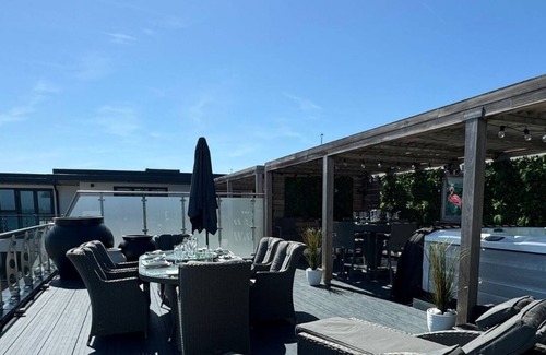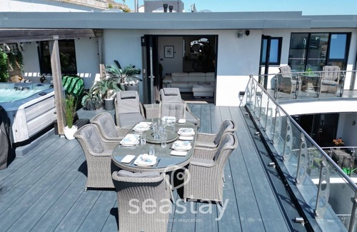 Named after the Roman Goddess of Sunrise 🌅 This luxurious 2-bedroom sea-view penthouse in Ramsgate offers breathtaking coastal views. The open-plan living area features floor-to-ceiling windows, a modern kitchen, and elegant furnishings. Both bedrooms are spacious, with the master having an en-suite. The private terrace boasts a hot tub, perfect for unwinding while enjoying the ocean view. With private parking and direct beach access, it’s the ideal retreat for comfort, relaxation, and seaside