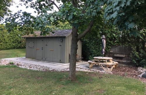 Suitable for recreational rental. Also suited for people building in the area, as there is a very large garage with parking for one car, also suitable for workshop/storage. Garage #2 is a 1.5 car garage. House is furnished. Walk to Thornbury downtown/harbour, or ride the Georgian trail, etc. 20 mins to Collingwood, 10 mins to Georgian Peaks etc. Very private, small view of Georgian Bay from the upper deck through the trees.