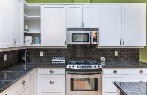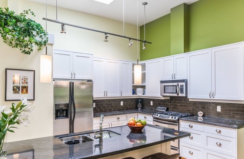 The deluxe kitchen features granite countertops and full size stainless steel appliances including a gas top range, electric oven, microwave, and dishwasher. The kitchen island seats 3 and the dining area seats 6 with table settings for 8. A full range of spices is provided.