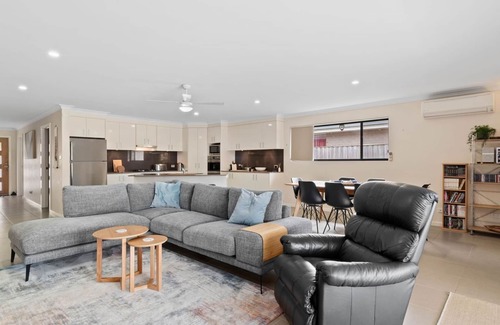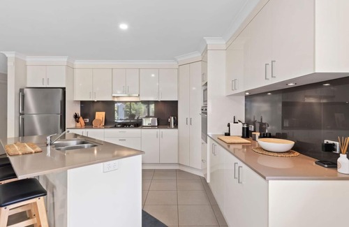 The spacious main bedroom has a King bed, large ensuite, walk in robe and sliding door access out to the back garden. The additional two bedrooms have queen beds and one has an extra single bed and a trundle for the family to share and are at the other end of house and are all generous in size and have built in robes. The bedrooms all take advantage of lovely plantation shutters.