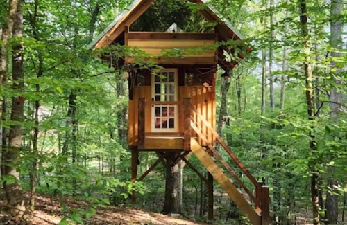 Welcome to our beautiful timber-frame treehouse! Hand built by local master carpenter David Green, this is truly a work of art. It is a two-story dwelling with two porches, lofted bedroom (with queen bed) living room and kitchen/prep area.