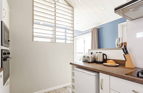 This holiday home is simply stunning! Ultra modern with blue and white sharp clean lines, it is ideal as a romantic retreat for a couple. it features a double bedroom with en suite shower facilities. The open-plan living space is bright and airy with patio doors allowing the daylight to flood in whilst allowing the discerning visitor the opportunity to enjoy and admire the stunning view over to Sandymouth Bay. You will simply want to return to this delightful haven!