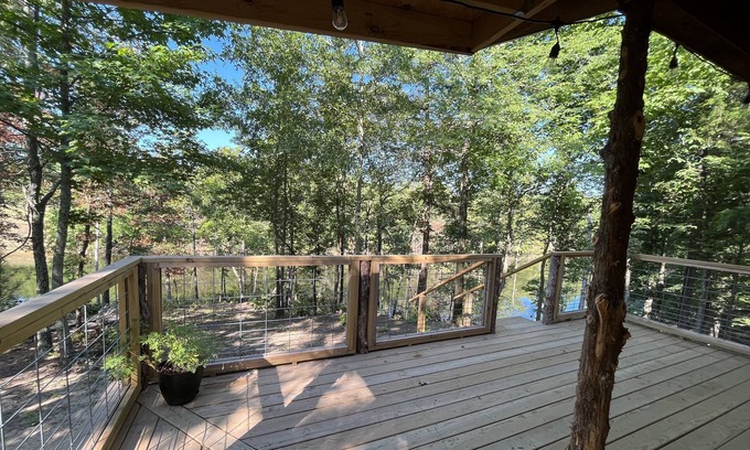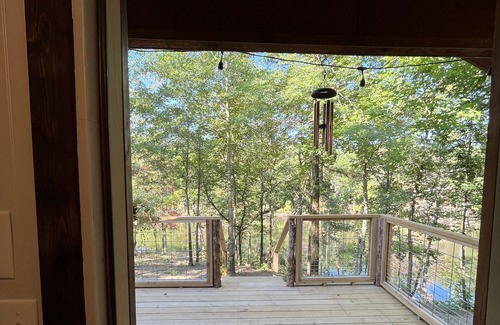 The cabin has a spacious porch, perfect for sitting & sipping. Even has a private vintage tub to soak in the scenery.