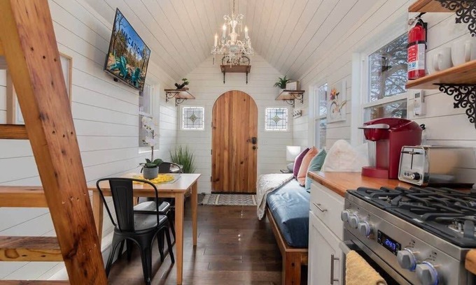 Escape the norm with a relaxing and adventurous retreat. Our tiny home is tucked privately in the woods to provide a truly peaceful and unique experience but is also located just 10 minutes from the Branson Landing and Downtown shopping. This tiny home isn't short on comfort, boasting a king bed, spacious bathroom, washer and dryer, a living room with a big screen TV, and a full kitchen, complete with an oven, 4-top burner, large sink, dining room table, and a full-size refrigerator.