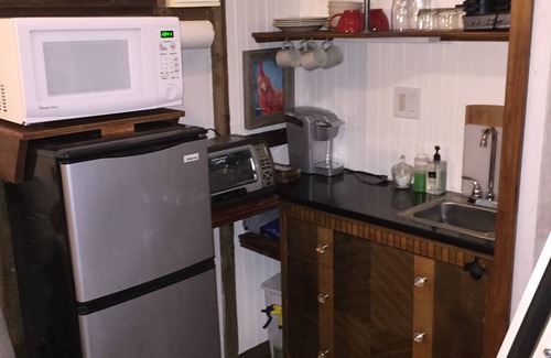 Our Tiny House apartment is nicely appointed with a cozy lounge area including a couch with HD TV, a loft bedroom with a new full size mattress, full bathroom with shower, kitchenette with quartz counter top, small refrigerator/freezer, hot plate cooking burners, kettle, microwave, toaster oven, egg sandwich maker, pots and pans, utensils, plates, glassware, WIFI, Weber propane grill.