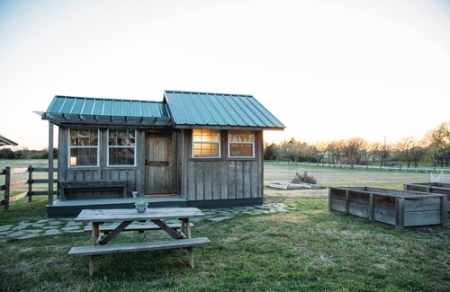 This tiny cottage is nestled behind an old farm house on a 100-acre working farm just 25 mins south of downtown Dallas. The 200-square foot space features a detached / shared bathroom connected by the front porch with beautiful stock tank soaker tub. Inside there is a bunk-room complete with full and twin size beds, a cozy loft with a queen mattress, and quaint living room with futon, electric kettle, microwave, and mini fridge. If you need a place to escape the hustle and bustle, this is it!