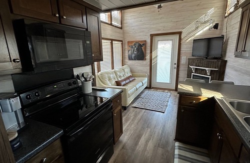 Enjoy this unique and serene tiny house getaway on a 50-acre farm. Cute animals at every turn, including alpacas, goats, ponies, sheep, horses, ducks, chickens, donkey, cows, and more. Family and pet friendly. We hope to see you soon!