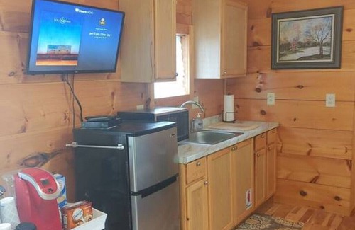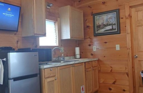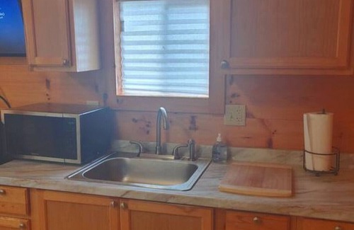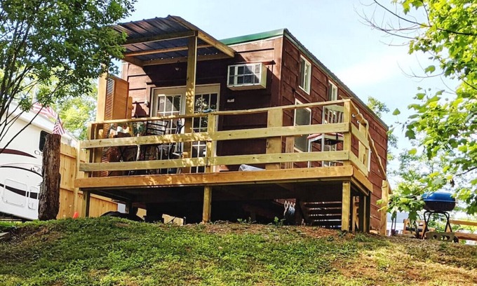 Tiny House Glamping at Watts Bar. Take it easy at this unique and tranquil getaway. It is the perfect tiny home to stay by the lake with water access two blocks away. It has everything you need (plus a few little extras) and nothing you don’t! This open airy floor plan with a single bedroom and open concept living room. There is a small dining area inside, a bistro table for two over looking the green belt and outside seating for four around the fire pit.