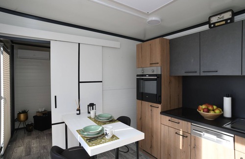 This modern and stylishly designed tiny house for a maximum of 5 people is located in the small village of Kleinschönau / Vitis in the picturesque Waldviertel in Lower Austria. The tiny house offers a beautiful living room/bedroom, a fully equipped kitchen, a spacious bedroom with two comfortable sleeping areas, a modern bathroom and a large garden with its own terrace. You can park directly at the tiny house. Kleinschönau / Vitis is located near the district capital Zwettl, known as a gourmet and shopping town, city wall town and brewing town and known for its historical heritage. Well-known sights include Zwettl Abbey, the Zwettl private brewery and the Lichtenfels castle ruins. The location is ideal for nature lovers! Nearby you will find picturesque swimming lakes that invite you to take a refreshing dip in the water in the warm months. During the winter months, the surrounding ski lifts are easily accessible and offer snow fun for the whole family. If you prefer hiking, the region offers a variety of hiking trails that take you through the impressive landscape of the Waldviertel. Directly in Zwettl there are plenty of shopping opportunities for your daily needs as well as a good selection of restaurants.
