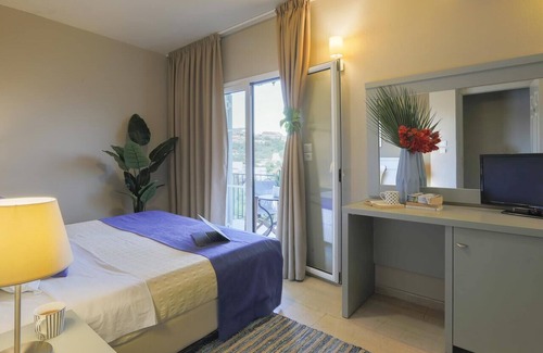 The beach ‘Megali Ammos’, and the country are just a stone’s throw away. All room types feature a balcony overlooking the endless blue.