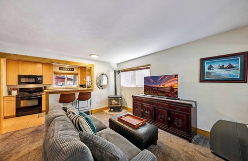 • Living Area & Dining: Cozy open-concept living room, Gas fireplace, 50” TV, 3-person sofa, Small dining table (seats 2–4 with extension), 2 counter stools at kitchen bar