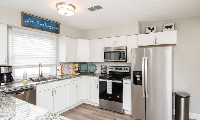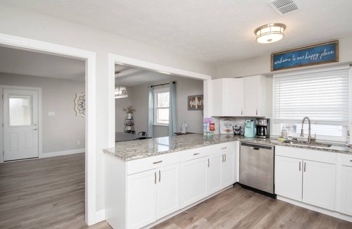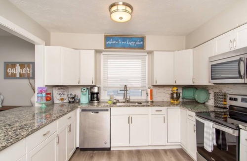 "The Flyer" is a clean and bright 6 bedroom, 3 full bathroom home perfect for comfort and relaxation. The kitchen features a large granite island and comes fully equipped with stainless steel appliances (range, refrigerator, dishwasher), coffee maker, pots, pans, toaster, and more. In the living room you will find a sofa, loveseat and two chairs, 50" smart TV, and games. The primary bedroom is located on the first floor and features a queen bed and double vanity bathroom with walk-in shower. Next to it is a second bedroom with 2 single beds and a full hall bathroom. The main floor also features a large dining room, and laundry area with a washer and dryer available for guests to use during their stay.