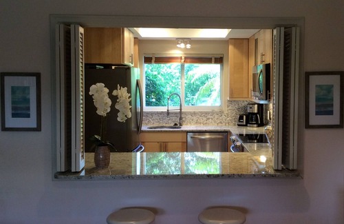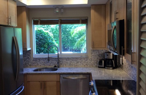 Easily prepare anything from snacks for your beach basket to gourmet meals in the very complete updated kitchen. The dining area and comfortable living area has plenty of seating for relaxing with friends and family. Private WiFi allows guests to keep up with business and social applications. A powder room rounds out the spacious main level. Just out the big glass doors discover an inviting patio, ideal for relaxing or for enjoying a delightful outdoor meal overlooking the swaying palms in the garden area.