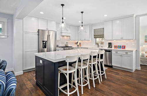 Lounge in the light, open and airy living area with tasteful furniture and three wall-mounted flat-screen Smart TVs. You'll love the high-end beach-cottage decor! Spend relaxing movie nights inside the vacation rental home snuggled up on comfy couches adorned with copious pillows. Prepare home-cooked dinners in the modern and fully equipped kitchen, which shares an open floor plan with the dining area and living room. Gather around the lovely 8-person dining table and four (4) island stools to enjoy quality family time over delicious feasts!