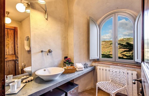 The Tower's terrace perched at the top of five high floors - with elevator of course - is perfect for summer dining with a bird's eye view, cocktails or sunbathing when you chose a change from the pool. The terrace crowns a collection of beautifully renovated and decorated suites and apartments, making a total of 6 bedrooms and 7 bathrooms, sleeping up to 12 people. Each room boasts historic and characteristic features, such as terracotta floorings, beamed ceilings, stone fireplaces, and ancient doors that has been combined so cleverly with a modern artistic furnishings that combines family antiques with modern and contemporary design pieces. The Torre offers an unforgettable and unique experience of living in a real medieval fortified castle in exclusivity.The castle interior with its high ceilings and soothing proportions, and artful while cheerful furnishings, provides guests with large and gracious areas to share both family, social and personal moments. Though rented as a an exclusive use property each floor offers a private hall with seating area, and bedrooms and bathrooms. In addition to the ground floor kitchen, there are two independent kitchens at the third and the fourth floor which can be used for breakfast, lunch and dinner. You can also enjoy your outdoor meals, on the magnificent 360° panoramic terrace (25 sq.mt.), or in the shade of the ancient trees of the park. The swimming pool, located in a sunlit and peaceful area between olive trees and rosemary, offers moments of pure pleasure in a truly Italian ambiance.