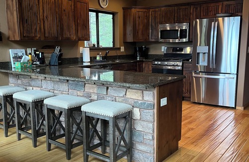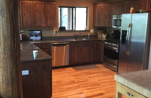 The downstairs family room has a cozy gas fireplace and large windows with stunning views of the pines. There is also a 55" TV for movie nights or sports. The dining room/breakfast bar exits to the expansive patio with gas grill. The kitchen has stainless steel appliances and all conveniences of home.