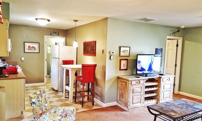 Charming town view suite with king bedroom, living room with cable TV, full kitchen & private bathroom. Sandaway Suites & Beach is located in the historic district of Oxford, MD. Walk to several restaurants and shops. With stunning views and a private sandy beach on the Eastern Shore of MD rests our boutique hotel. Experience in-room comforts and in-town conveniences. Take a day trip to St. Michaels, Easton, or Cambridge. At the end of the day, see an awesome sunset at Sandaway's private beach.