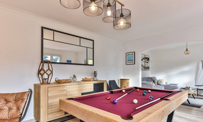 🔹 A dining room, with a table convertible into a billiard table, its 6 pins and a fireplace area open on a living room area with two armchairs, television equipped with a speaker, board games and books