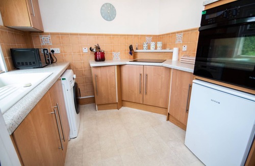 On the ground floor: The lounge offers guests comfortable seating for up to 4 guests, TV and a wood-burning stove. The dining room has a dining table and chairs seating 4 guests. The kitchen is equipped with an electric oven, hob, fridge/ freezer, microwave, dishwasher, washing machine and ample pots, pans and kitchenware. The windows overlook the gardens. The shower room has a shower cubicle, wash basin and toilet.